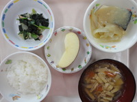鯖と玉ねぎの味噌煮 ほうれん草とベーコンのソテー たぬき汁 ごはん(納豆) りんご |