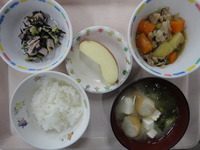 肉じゃが ひじきサラダ 勝山水菜の味噌汁 ごはん りんご |