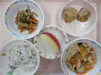 がんもどきの煮付け きんぴらごぼう 煮込みうどん わかめごはん りんご |