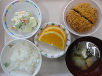 ミンチカツ ポテトサラダ 厚揚げとかぶの味噌汁 ごはん オレンジ |