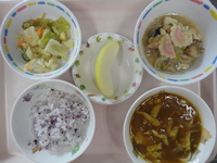 鶏肉のすき焼き風煮 ごま酢キャベツ カレーうどん ゆかりごはん りんご |
