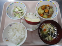 じゃが芋の昆布煮 ハムサラダ 青菜の味噌かき玉汁 ごはん りんご |
