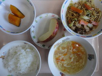 焼きそば カボチャ煮 コーン卵スープ ごはん りんご |