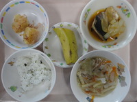 鶏肉とさつま芋の中華煮 厚揚げの煮物 味噌汁(白菜) ごはん りんご |
