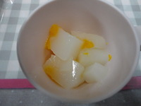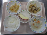 里芋と豚肉の煮物 切り干し大根の含め煮 コーンシチュー ごはん りんご |