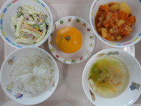 ポークビーンズ マカロニサラダ わかめスープ ごはん みかん |