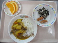 ウインナーソテー ひじきサラダ カレーシチュー ごはん オレンジ |