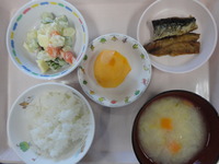さんまのかば焼き マセドアンサラダ 打ち豆汁 ごはん 柿 |