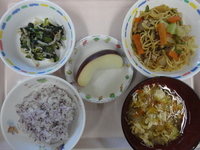 焼きそば 小松菜ともやしのお浸し かき玉汁 ゆかりごはん りんご |