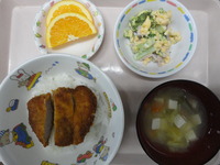 ソースカツ丼 ブロッコリーと卵のサラダ 味噌汁(白菜) ごはん オレンジ |
