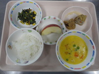 がんもどきの煮付け 青菜とコーンのごま和え かぼちゃのシチュー ごはん りんご |