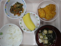 白身フライ きんぴらごぼう 麩のすまし汁 ごはん バナナ |