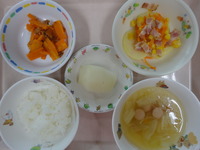ポテトとコーンのミルク煮 にんじんの和風サラダ 野菜とウインナーのスープ ごはん 梨 |