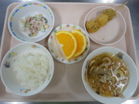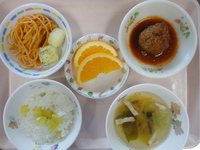 ハンバーグソース煮 スパゲティソテー 粉ふき芋 わかめスープ ごはん オレンジ |