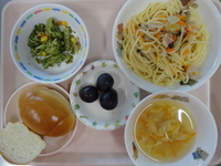 チキンときのこのクリームパスタ ブロッコリーのおかか和え コーン卵スープ バターロール 巨峰 |