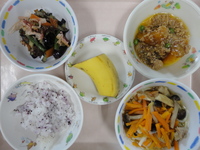 かぼちゃのそぼろ煮 秋ナスの甘辛炒め 煮込みうどん ゆかりごはん バナナ |