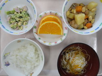 大豆の五目煮 ブロッコリーと卵のサラダ そうめん汁 ごはん オレンジ |