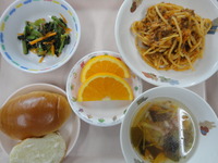 ミートスパゲティ 小松菜の梅和え わかめスープ ロールパン オレンジ |