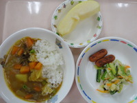 ウィンナーソテー 小松菜サラダ カレーシチュー ごはん りんご |