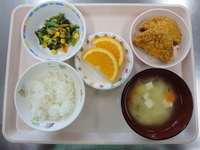 ミンチカツ 春の彩和え みそ汁(じゃが芋、玉ねぎ) ごはん オレンジ |