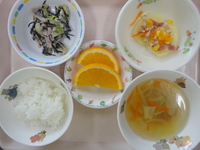 ポテトとコーンの重ね煮 ひじきサラダ 野菜とウィンナーのスープ ごはん オレンジ |