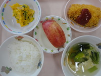 白身フライ かぼちゃサラダ かき玉スープ ごはん りんご |