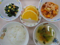 ポークビーンズ 青菜とコーンのごま和え ワカメスープ ごはん オレンジ |