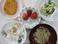コロッケ ブロッコリーと卵のサラダ すまし汁(白菜、えのき) 五目ずし いちご |