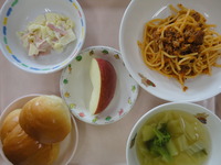 ミートスパゲティ 白菜サラダ コンソメスープ ロールパン りんご |