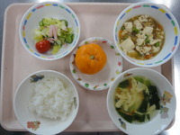 麻婆豆腐 コールスローサラダ 中華スープ ごはん みかん |