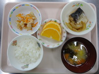 鯖の煮つけ 白菜のおかか和え さつま芋とえのきのみそ汁 ごはん オレンジ |