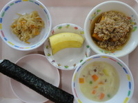 | フルーツポンチ | かぼちゃのそぼろ煮 切り干し大根の含め煮 コーンシチュー 細巻 バナナ |