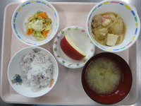 鶏肉のすき焼き風煮 ごま酢キャベツ なめこのみそ汁 ゆかりごはん りんご |