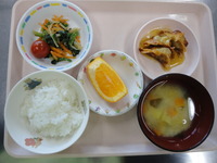 餃子のあんかけ 三色ナムル ミニトマト さつま芋とえのきのみそ汁 ごはん いよかん |