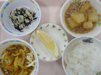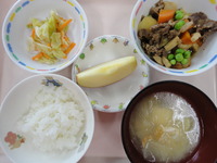 牛肉とじゃが芋の煮物 ごま酢キャベツ 白菜と厚揚げのみそ汁 ごはん りんご |