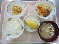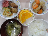煮物 里芋のころ煮 白菜のごま和え すこ みそ汁 ごはん オレンジ |