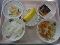 焼き鯖 さつま芋サラダ ビーフンスープ 麦ごはん バナナ |