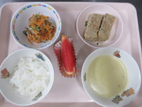 豆腐の松風焼き にんじんのじゃこごま和え さつまいものポタ-ジュ ごはん グレ-プフル-ツ |