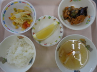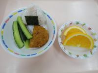 そうめん コロッケ スティックきゅうり 梅しそおにぎり オレンジ |