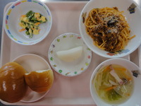 ミートスパゲティ いんげんの卵サラダ キャベツのベーコンスープ ロールパン 梨 |