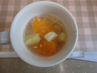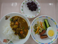| フルーツポンチ | ウィンナーソテー キャベツのおかか和え 夏野菜カレー ゆで卵 ごはん ブドウ |