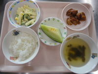 ごはん 鶏肉のバーベキューソース マカロニサラダ わかめスープ メロン |