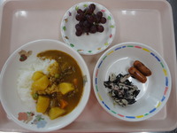 | オレンジゼリー | ごはん ウインナーソテー ひじきサラダ カレーシチュー ぶどう |