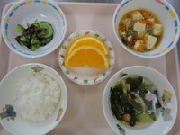 ごはん マーボー豆腐 わかめのすのもの しめじとチンゲン菜のスープ オレンジ |
