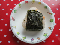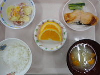 | 鮭わかめおにぎり | ごはん 鮭の西京焼き ポテトとコーンの重ね煮 スティックきゅうり みそ汁 オレンジ |