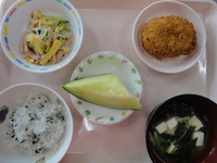わかめごはん コロッケ 冷ばん三すう みそ汁 メロン |