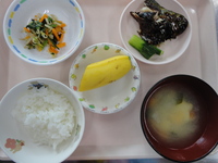 ごはん 焼き鯖 ほうれん草ともやしのお浸し スティックきゅうり 厚揚げと大根のみそ汁 バナナ |