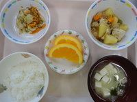 ごはん 厚揚げとじゃが芋のそぼろ煮 三色胡麻和え みそ汁 オレンジ |