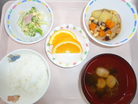 ごはん 大豆の五目煮 ブロッコリーと卵のサラダ すまし汁 オレンジ |