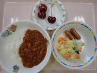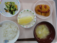 ごはん ウインナーソテー マセドアンサラダ ドライカレー オレンジ |
